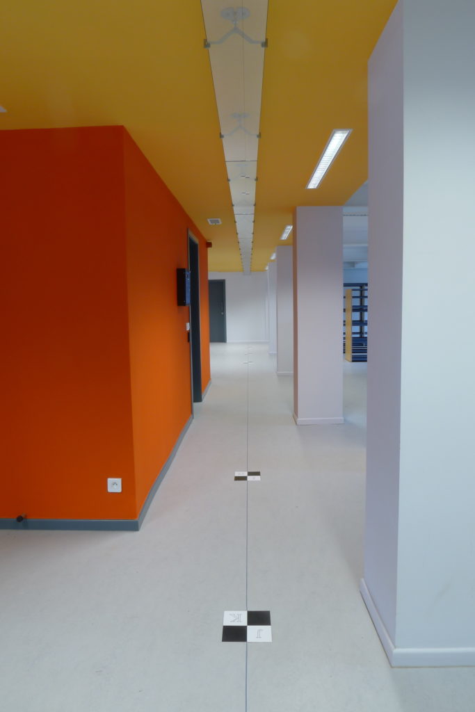 Point à la ligne • Implantation de l'intégration couvrant 3 niveaux (sols, murs, plafonds) de la nouvelle bibliothèque de la Région wallonne, Jambes (BE). Détail • 2011